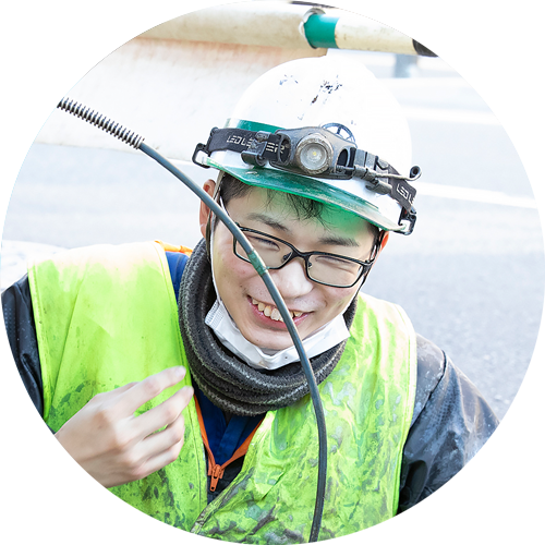 現在は年下が二人いるのですが、僕が入社した時は同世代がおらず、直の先輩は30代半ばの方でした。初めは緊張しましたが、仕事と人間性の両方を見守り、育ててもらえたことはありがたかったです。技術だけでなく、社会人としてのマナー・モラルを教えてもらいました。人は親や先生、部活の先輩などから影響を受けますが、社会での振る舞い方は会社の先輩にしか教えてもらえないと思う。就職からしばらく下水道の調査・修繕に大所帯のチームで臨み、いろんなタイプの先輩にしごかれたのもいい経験になりました(笑)。下水道清掃・調査・修繕。これら全ての業務をこなせるようになって一人前ですので、まずはプロの作業員を目指して頑張っています。